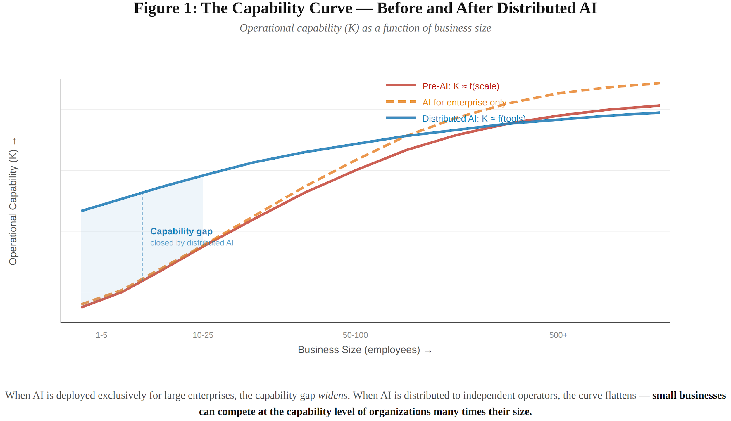 The critical question is who builds those tools and for whom. If AI tooling is built exclusively for large enterprises—which is the current default—the capability curve shifts up for incumbents while small operators remain locked out. The gap widens. If AI tooling is built for the long tail, the curve flattens. More participants can compete. Markets become more competitive. Extraction ratios fall. Productive capacity expands.