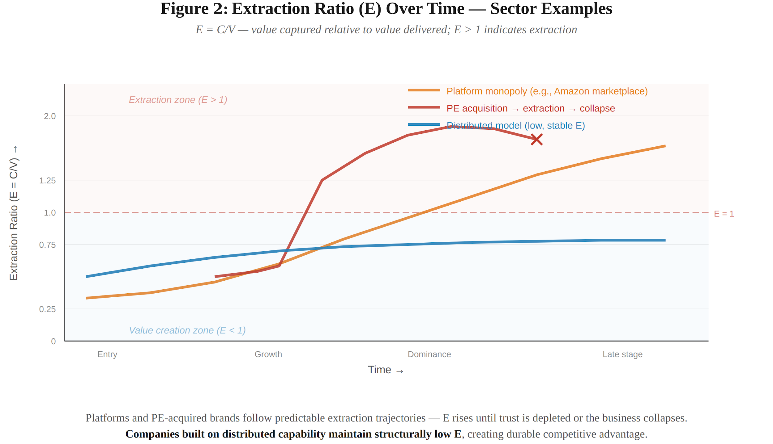 The trajectory of E over time (dE/dt) is the critical directional indicator. A competitive market pushes E toward E*—competition forces actors to create more value relative to what they capture. A consolidated market allows E to drift upward—reduced competition means actors can capture more while delivering less.