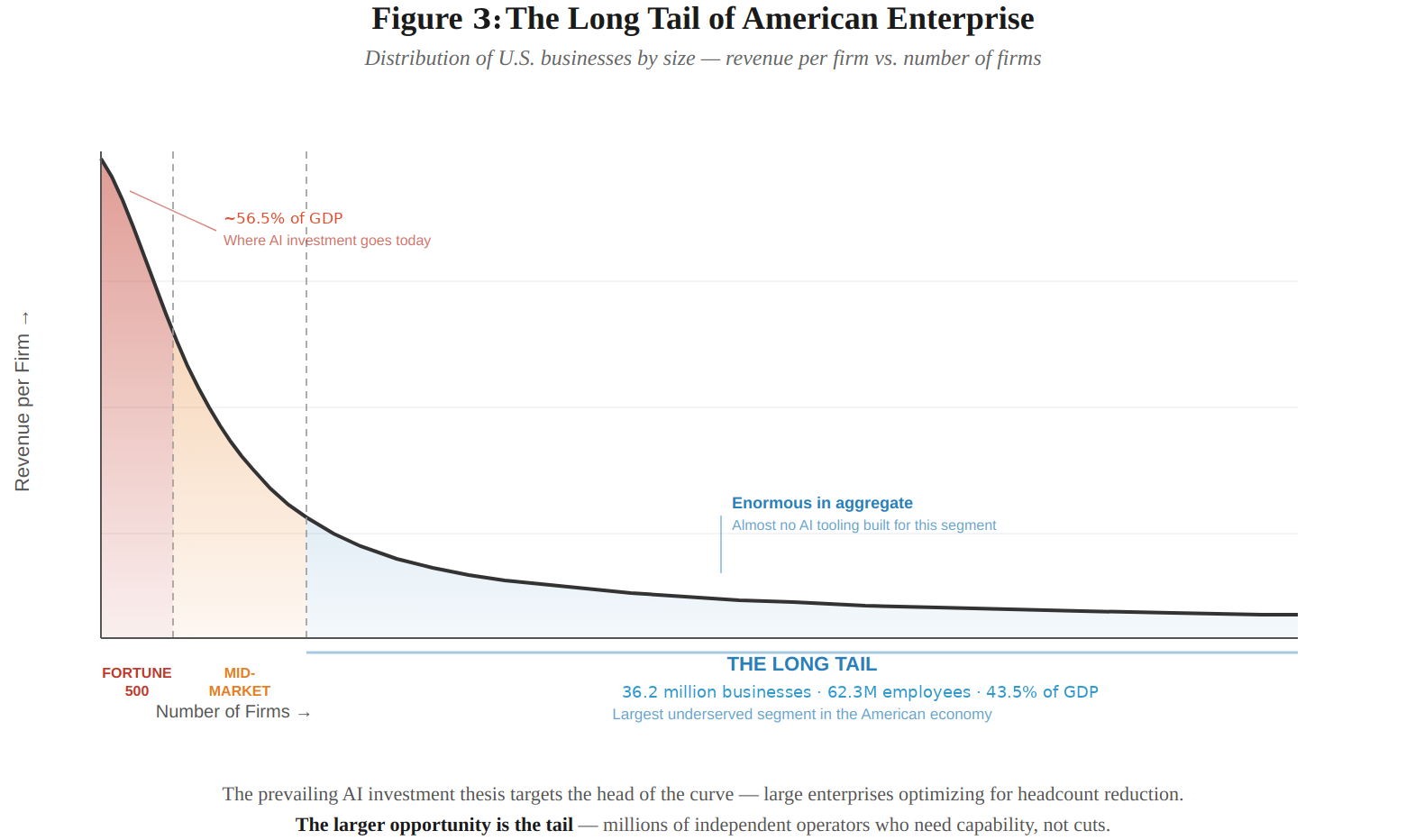 But the current investment wave is aimed almost entirely at enabling large enterprises to cut headcount. The tools are priced for enterprise budgets, sold through enterprise sales motions, designed for enterprise workflows. The long tail of small businesses—which collectively employ more Americans than all Fortune 500 companies combined—is being ignored.